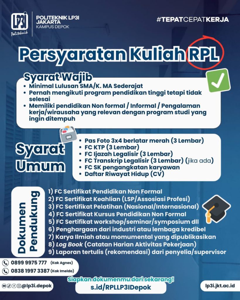 Dengan Program RPL, kami memberikan pengakuan kompetensi dan memungkinkan seseorang melanjutkan pendidikan formal atau meningkatkan karir tanpa harus mengulang materi yang sudah dikuasai.